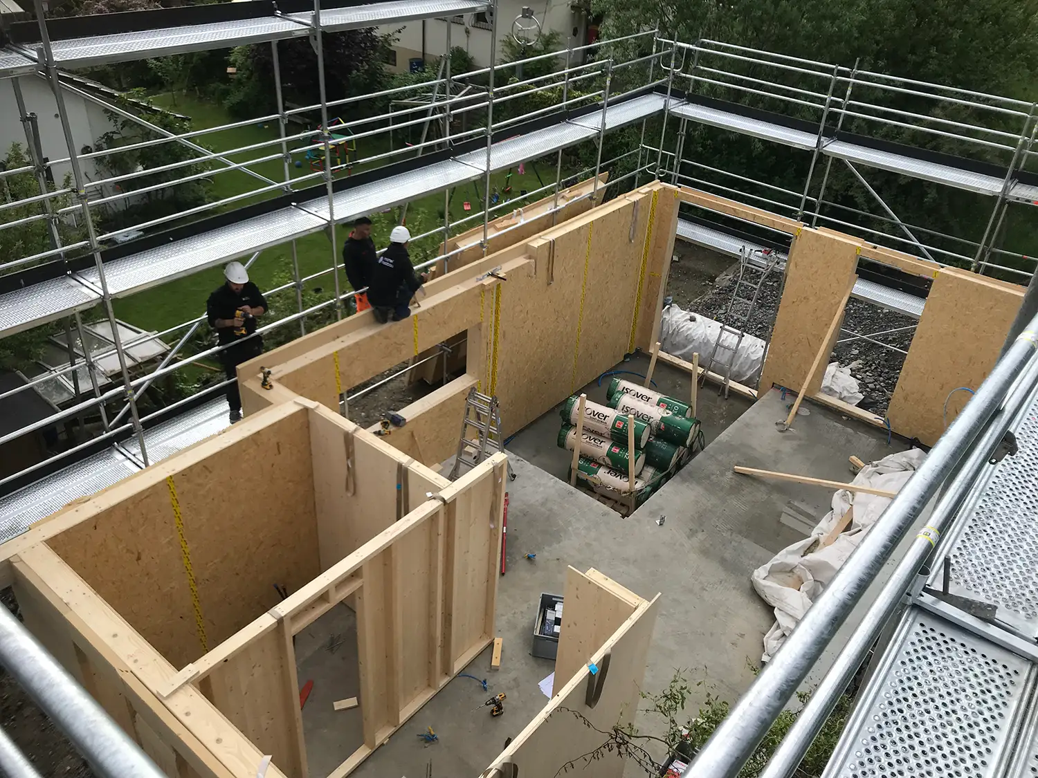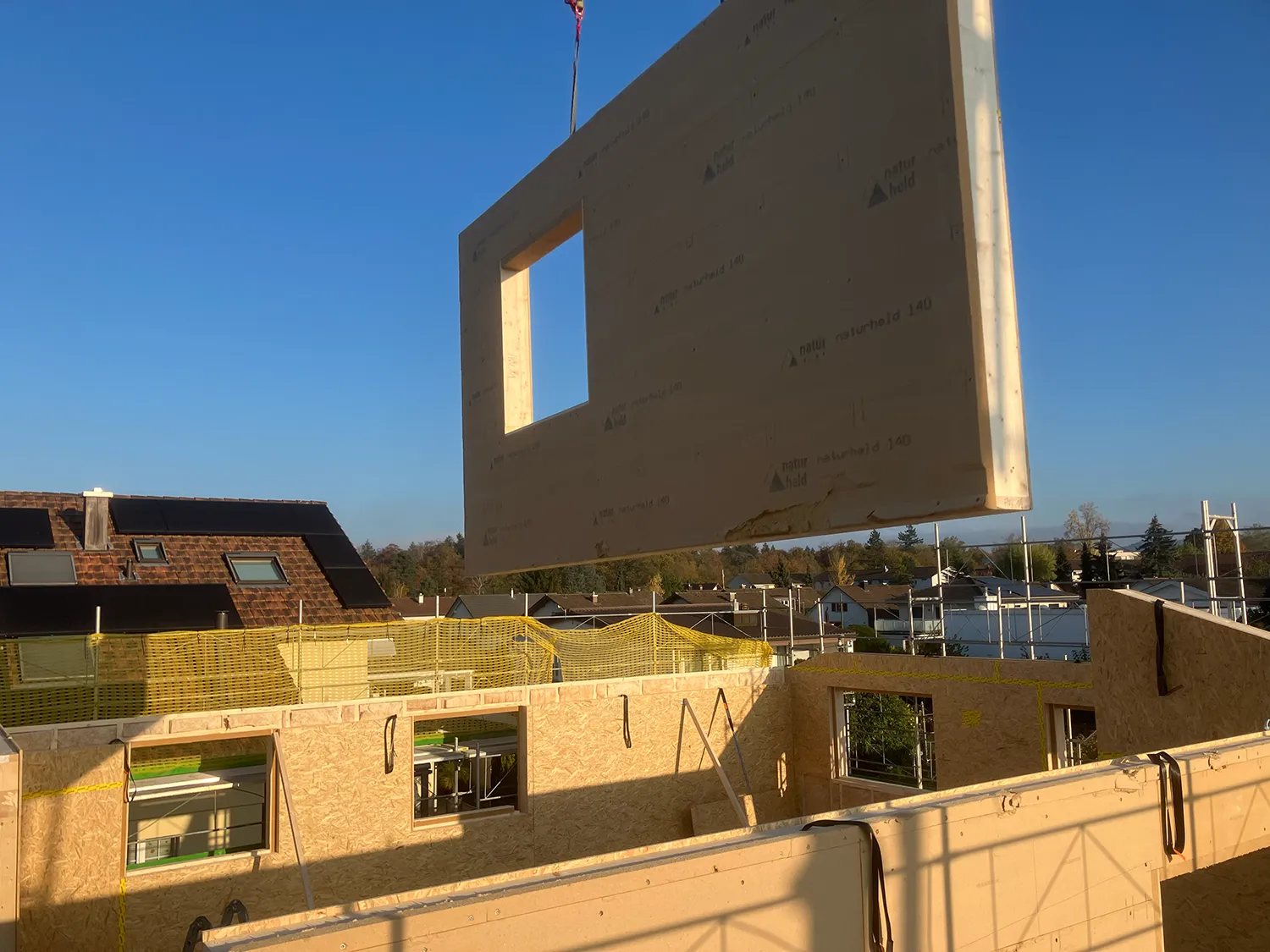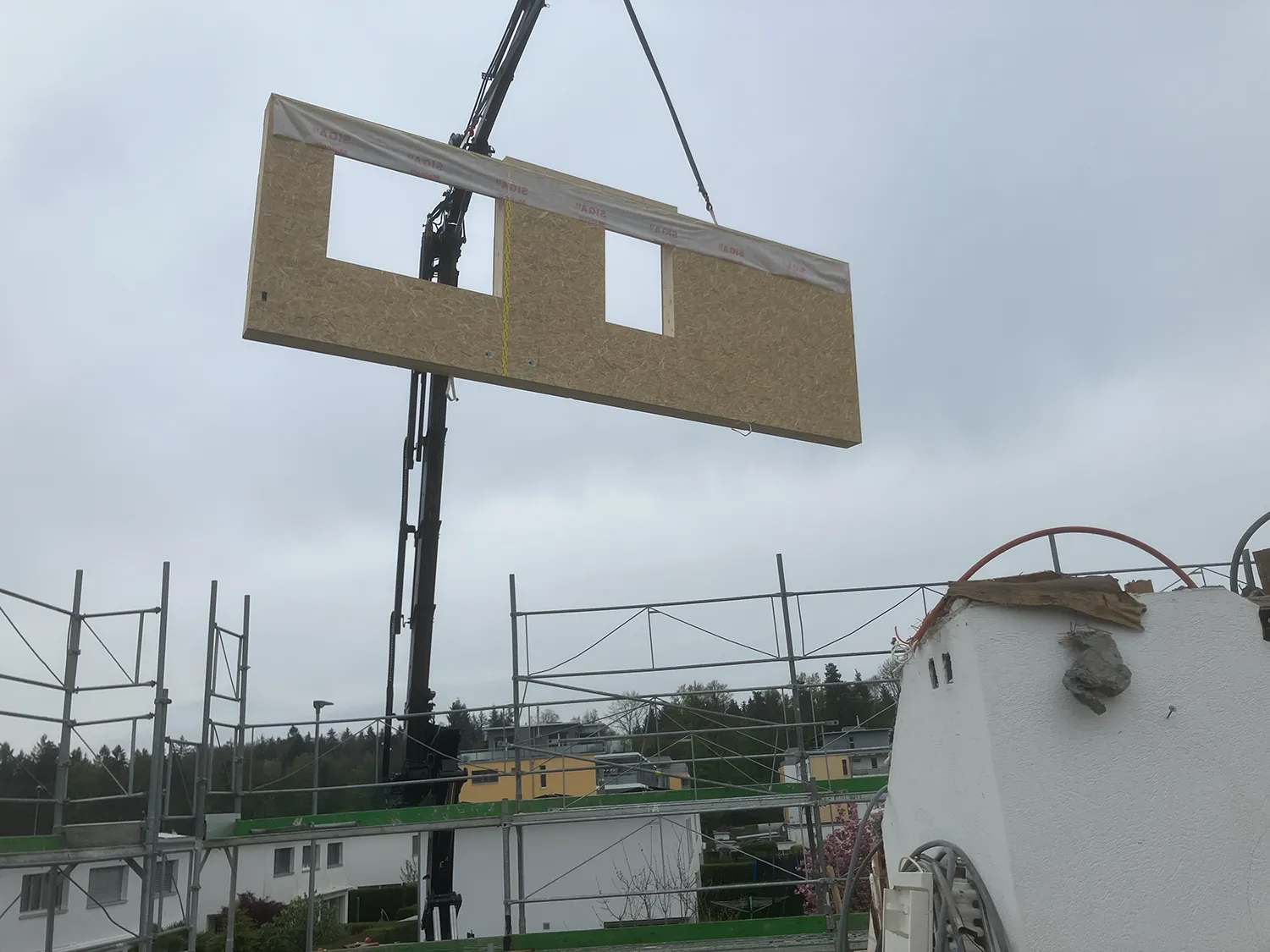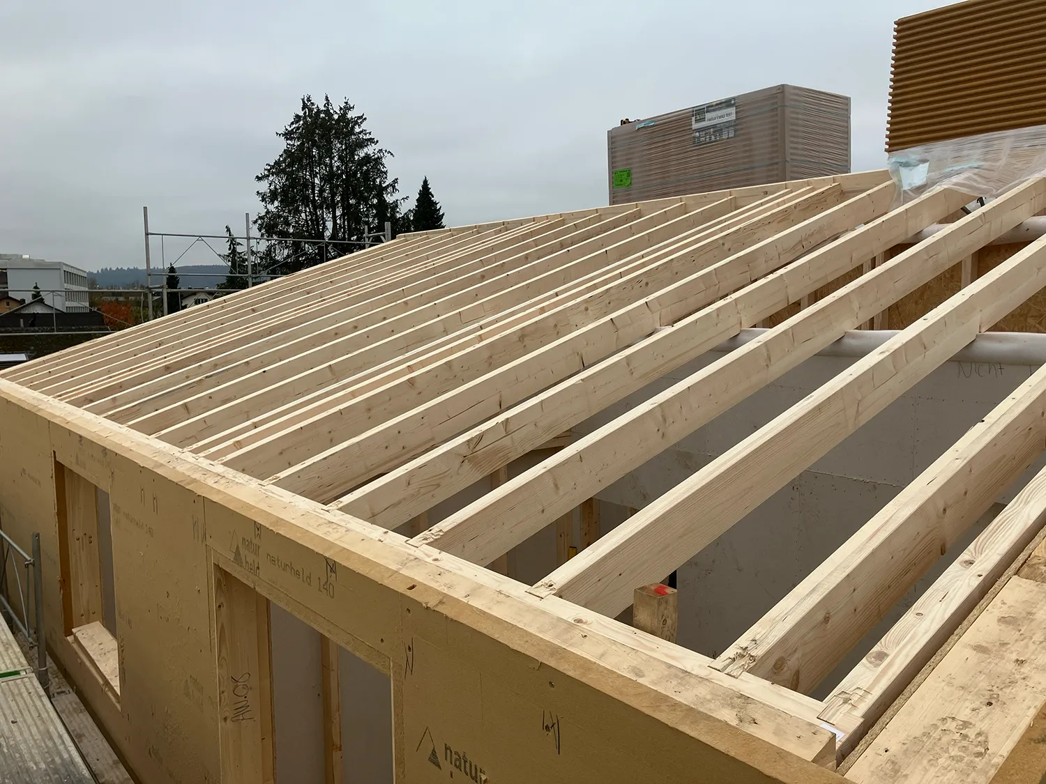 - Innen- und Aussenwände als Elemente vorgefertigt, Dachstuhl konventionell aufgerichtet