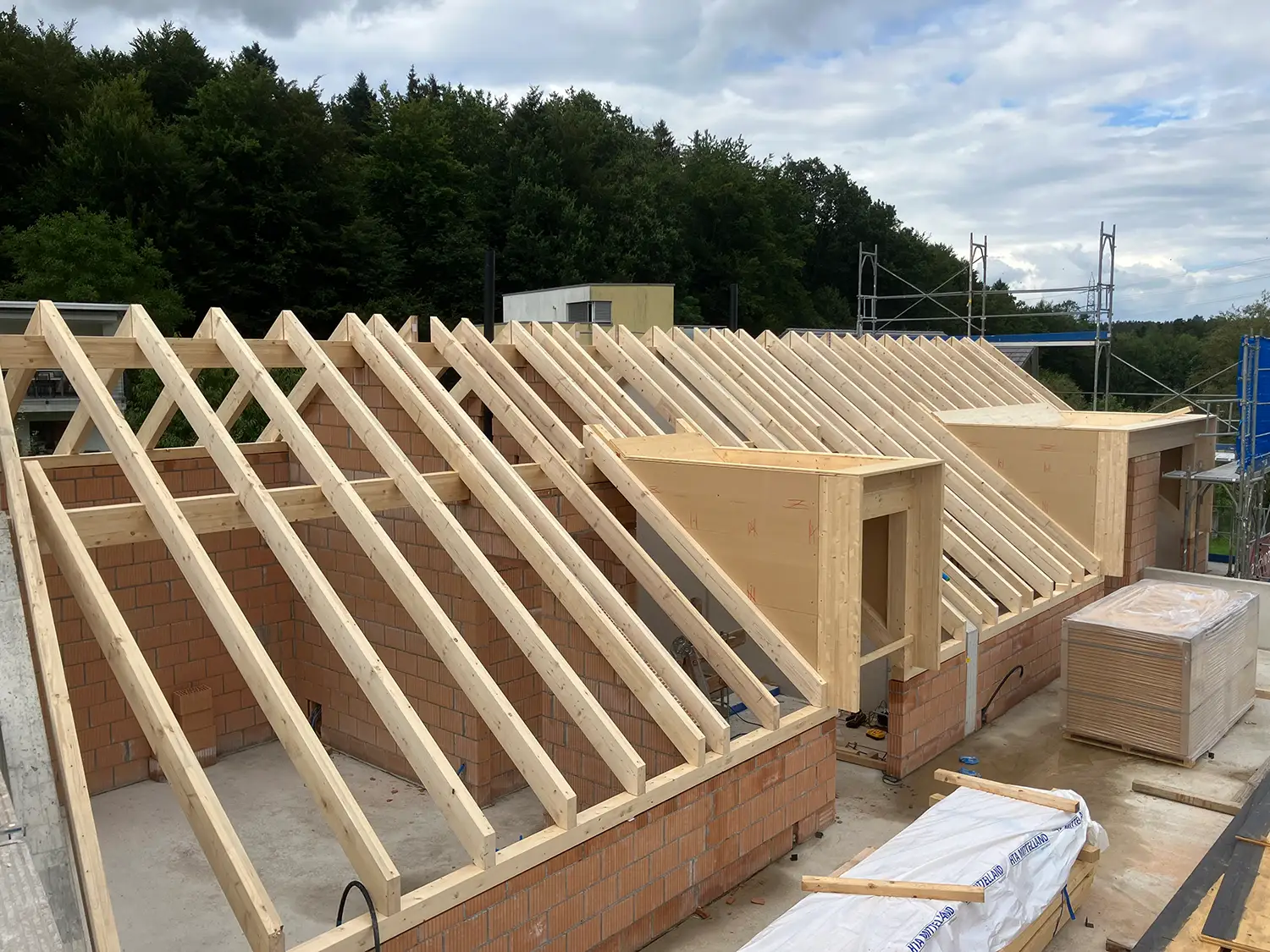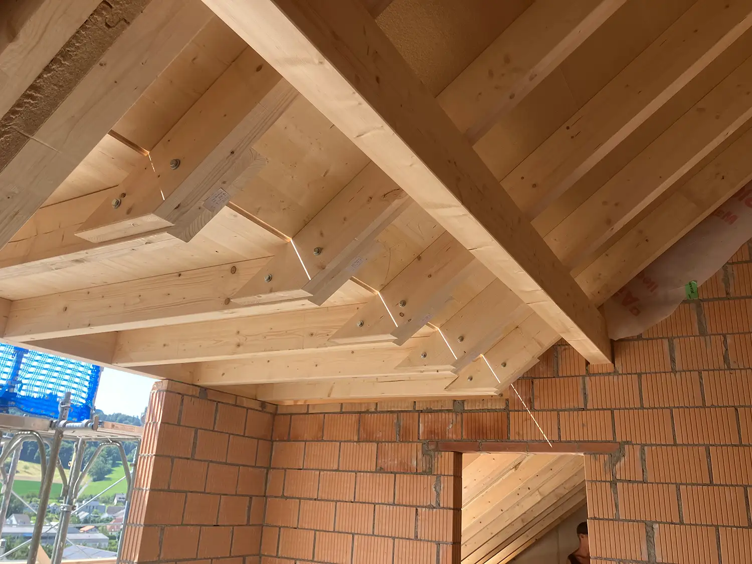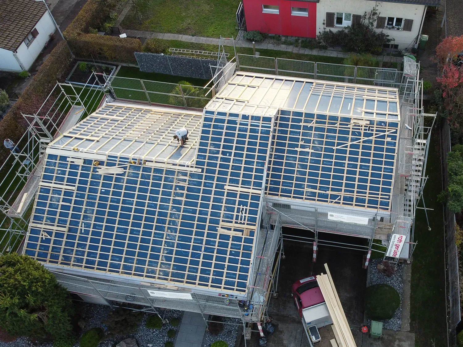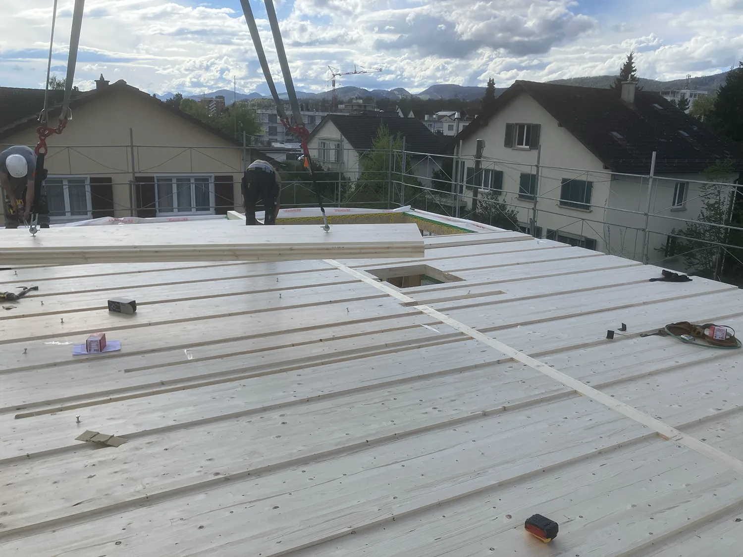 - Innen- und Aussenwände als Elemente vorgefertigt, Dachstuhl konventionell aufgerichtet