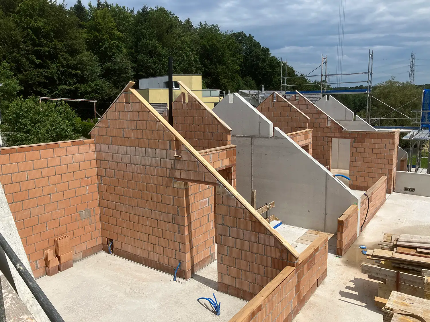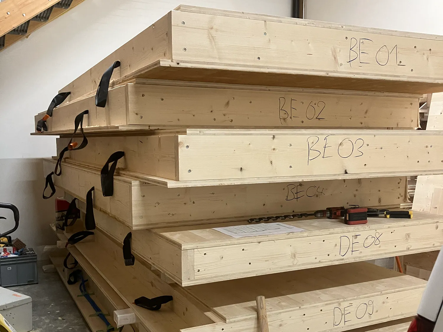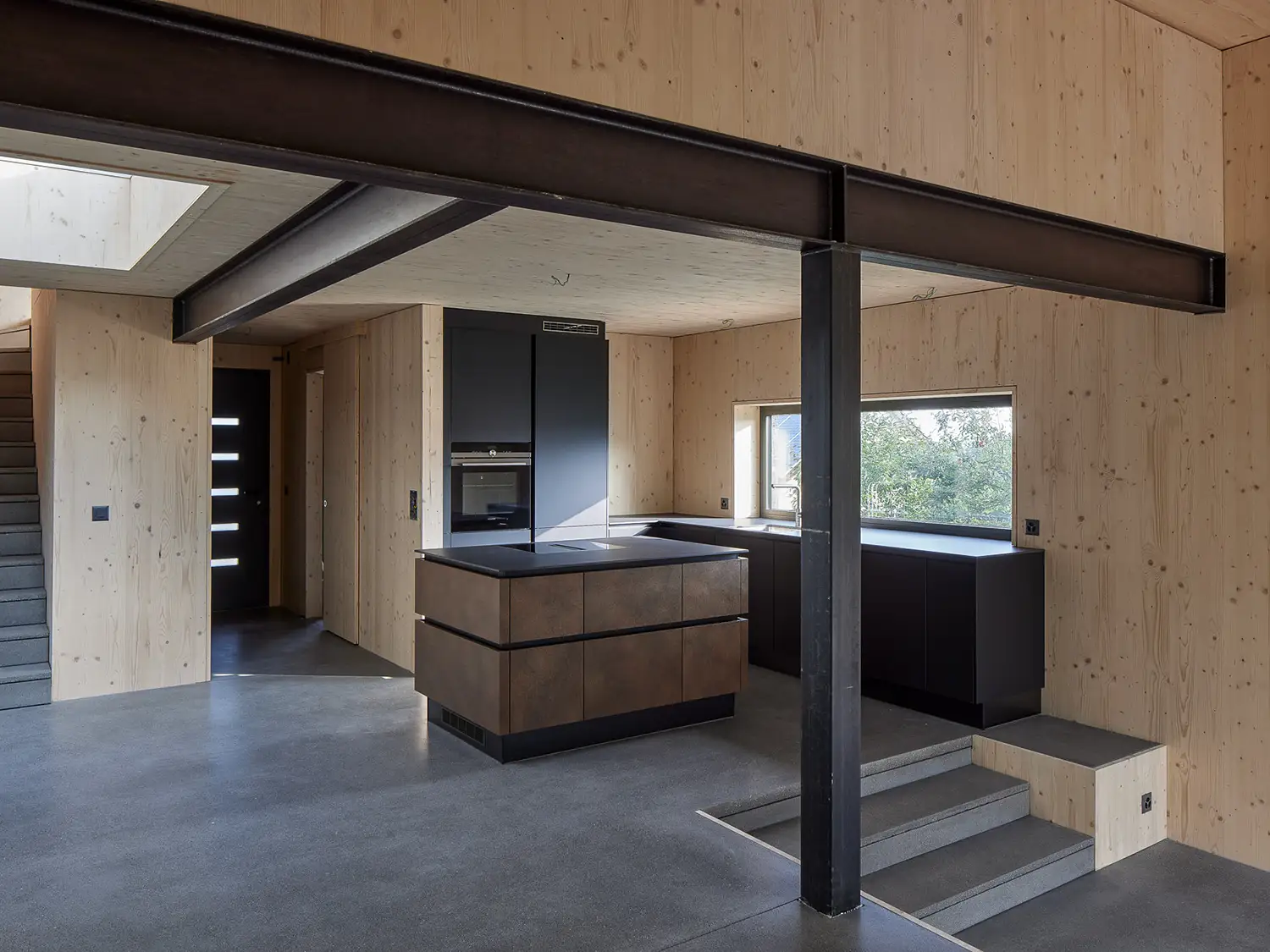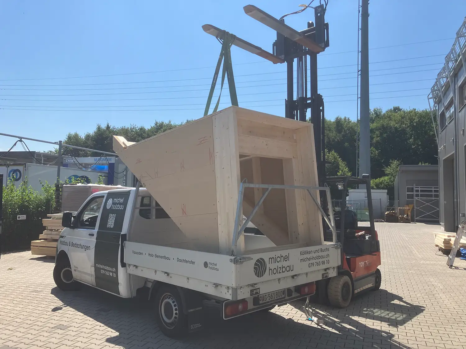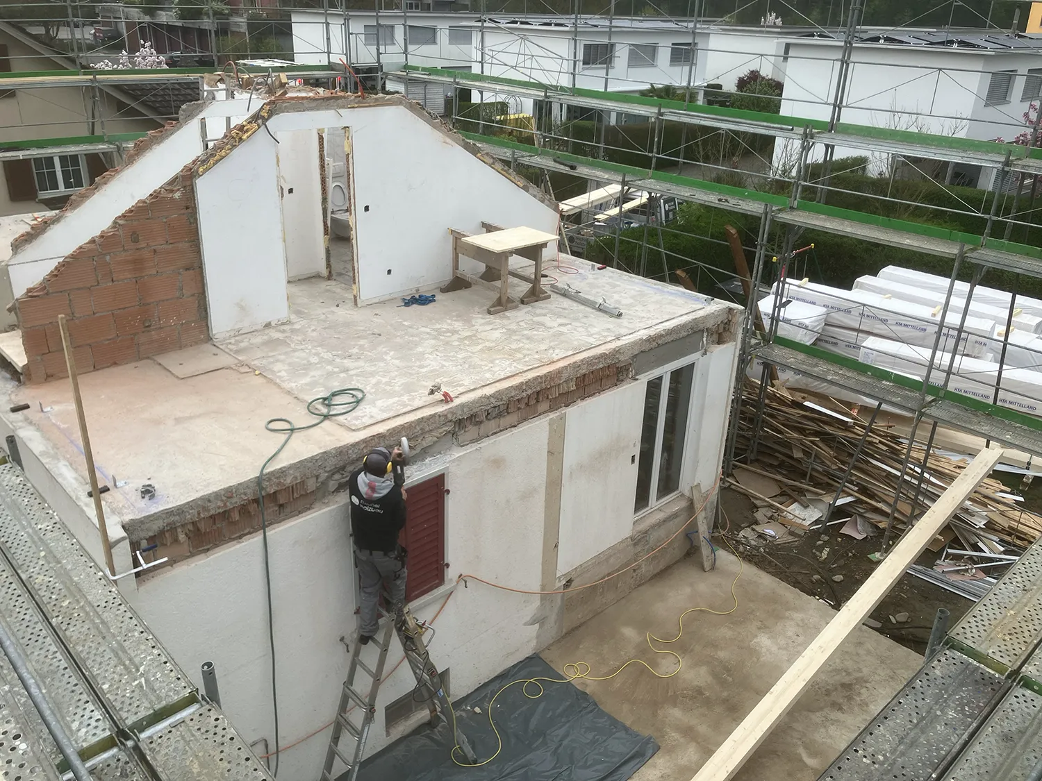 - Innen- und Aussenwände als Elemente vorgefertigt, Dachstuhl konventionell aufgerichtet