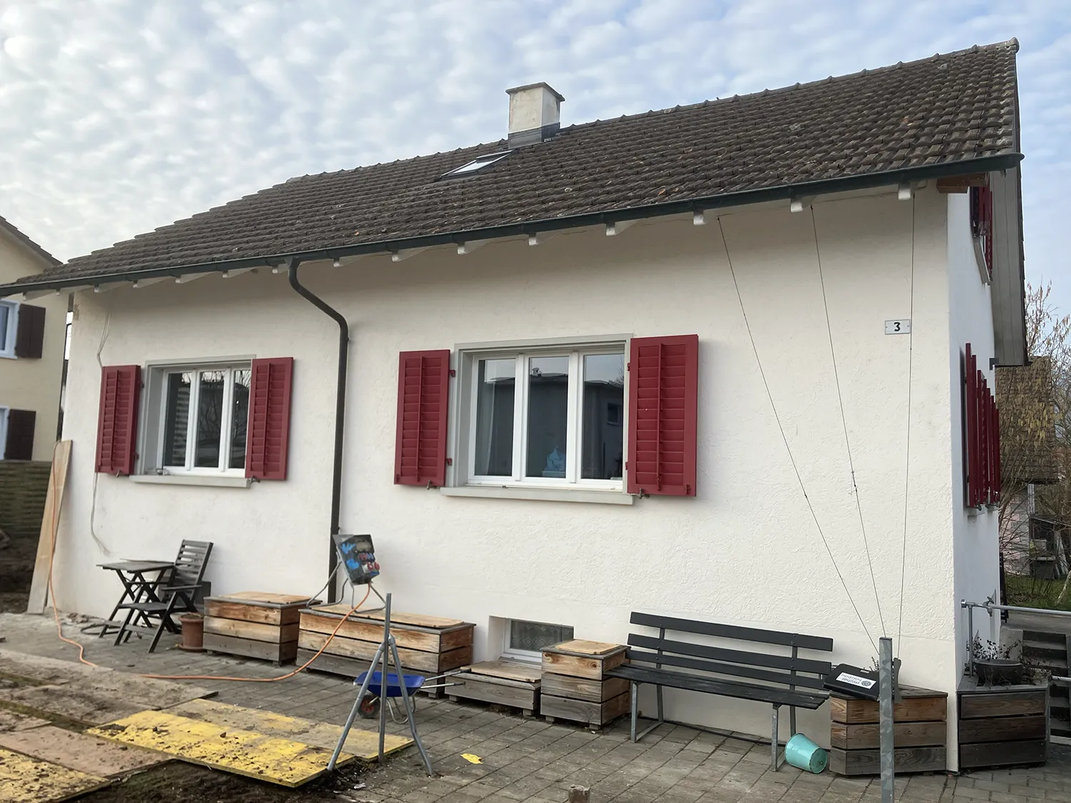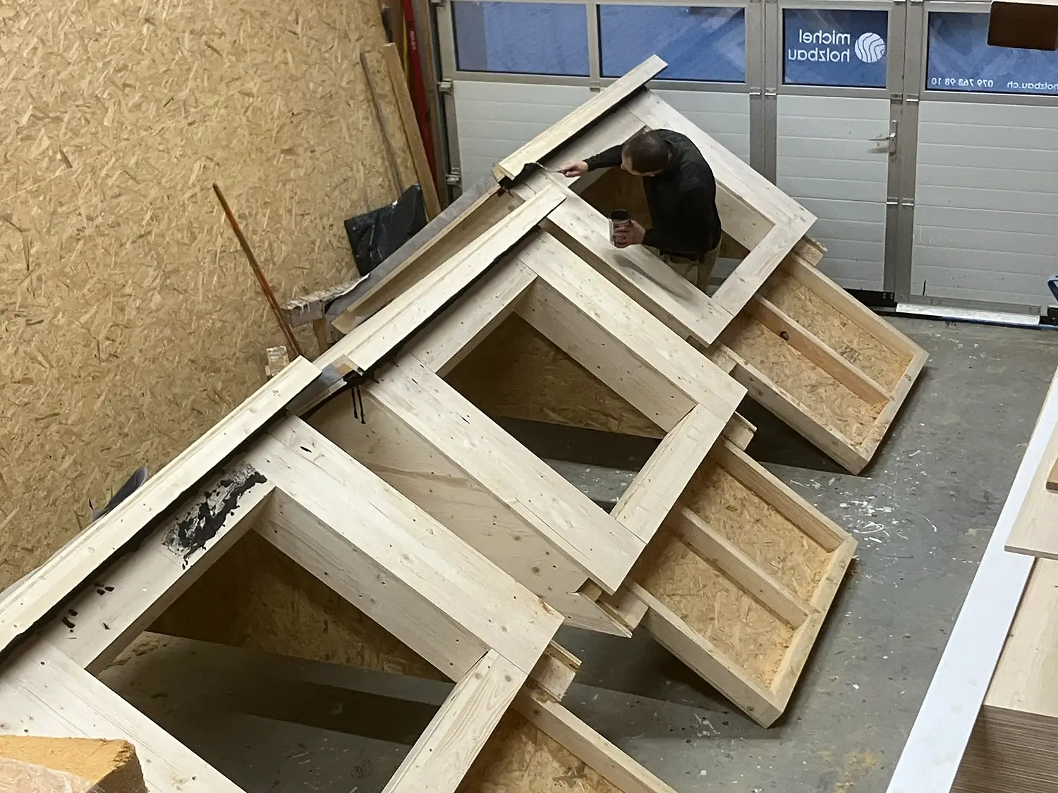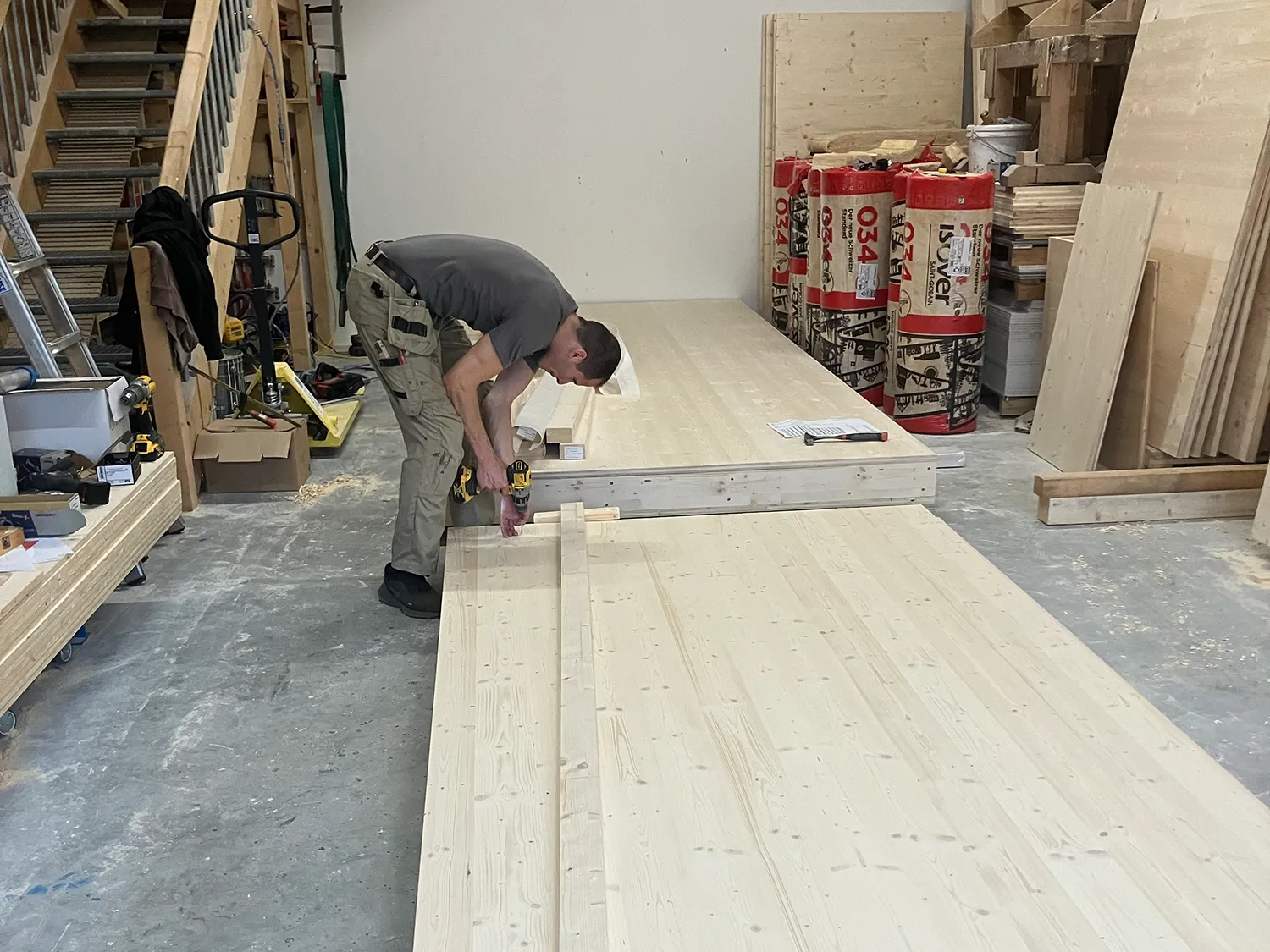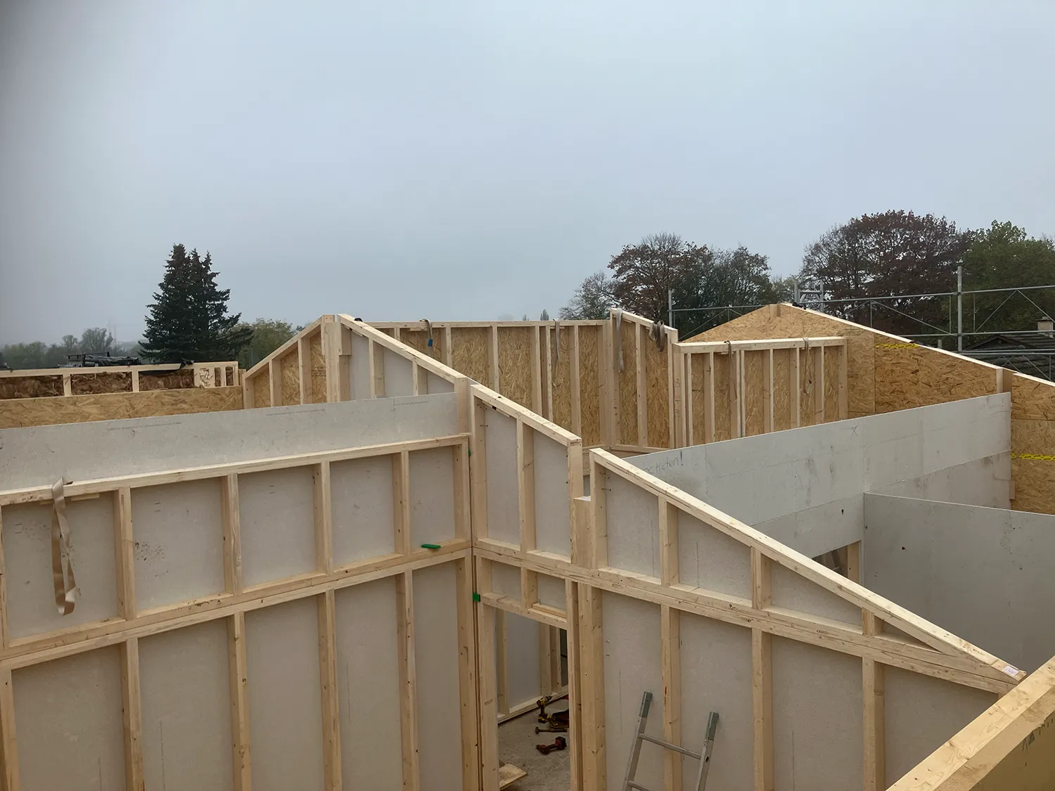 - Innen- und Aussenwände als Elemente vorgefertigt, Dachstuhl konventionell aufgerichtet