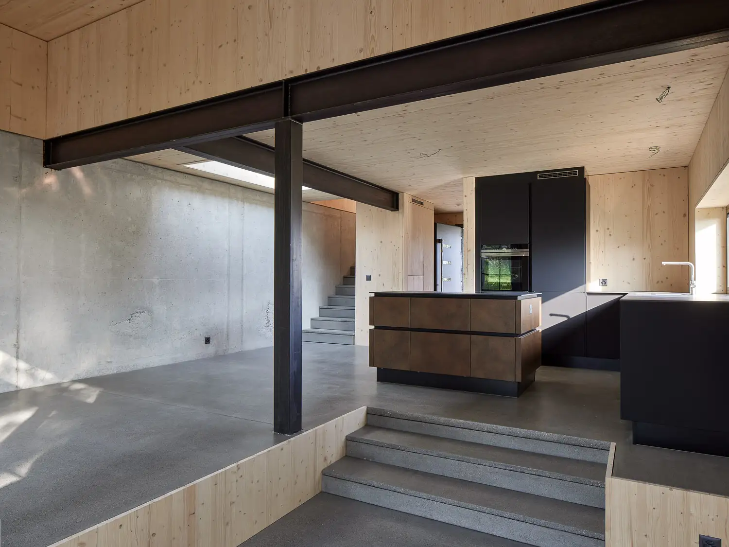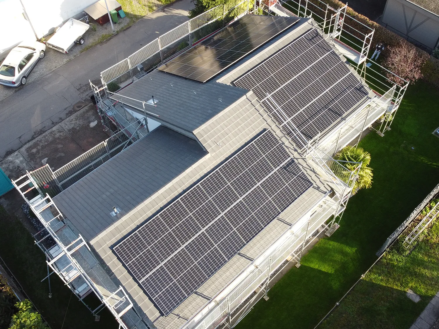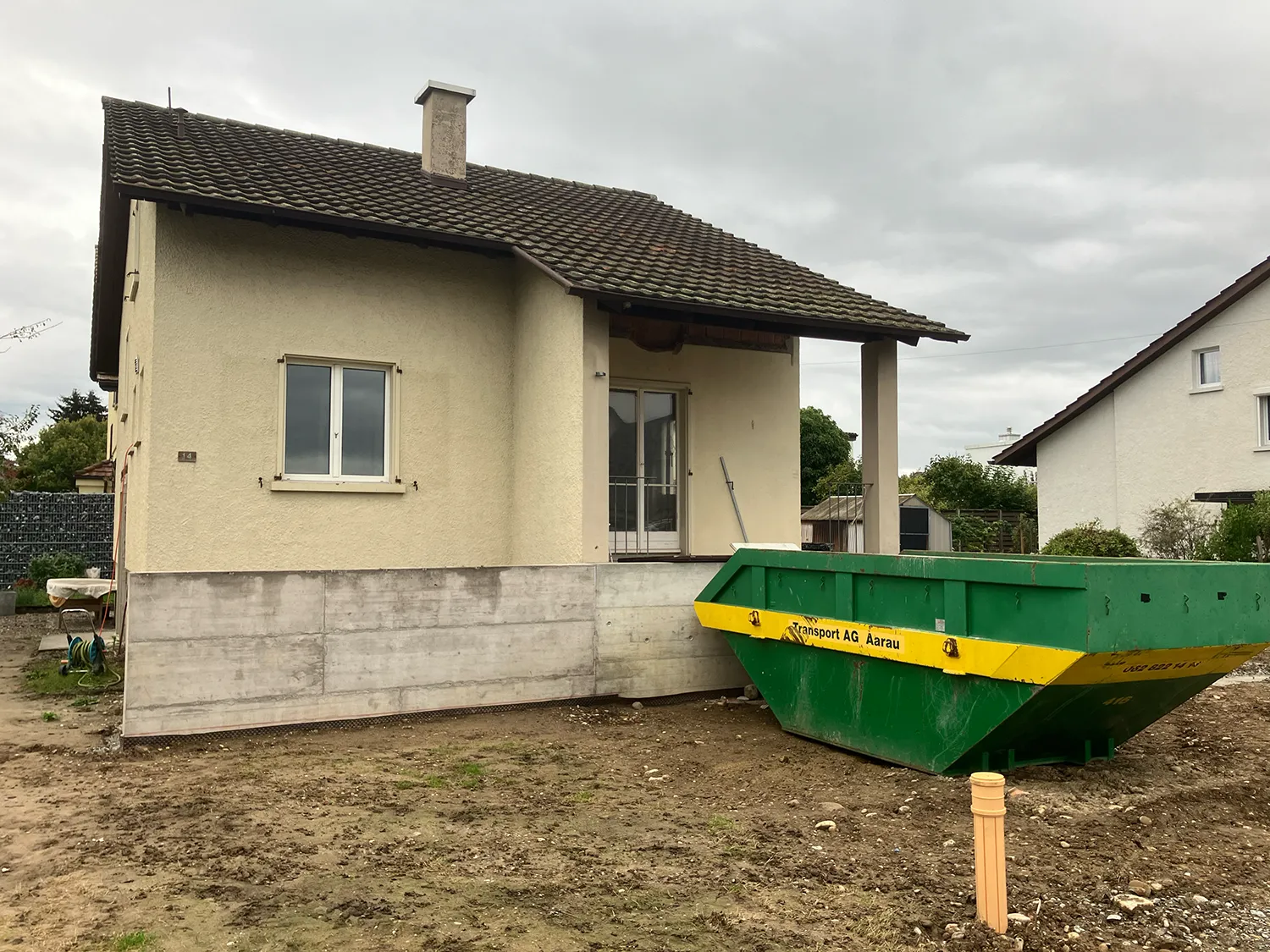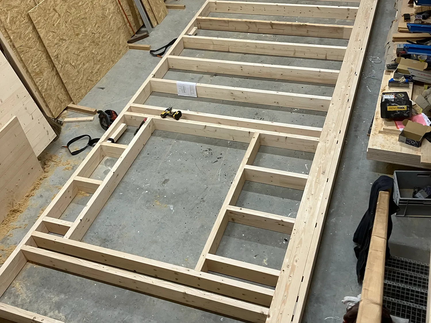 - Innen- und Aussenwände als Elemente vorgefertigt, Dachstuhl konventionell aufgerichtet